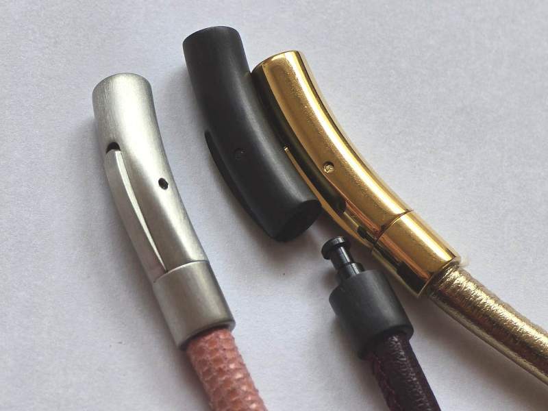 Mit Edelstahl-Hebeldruckverschluss in matt-silber oder -schwarz oder glänzend-gold.